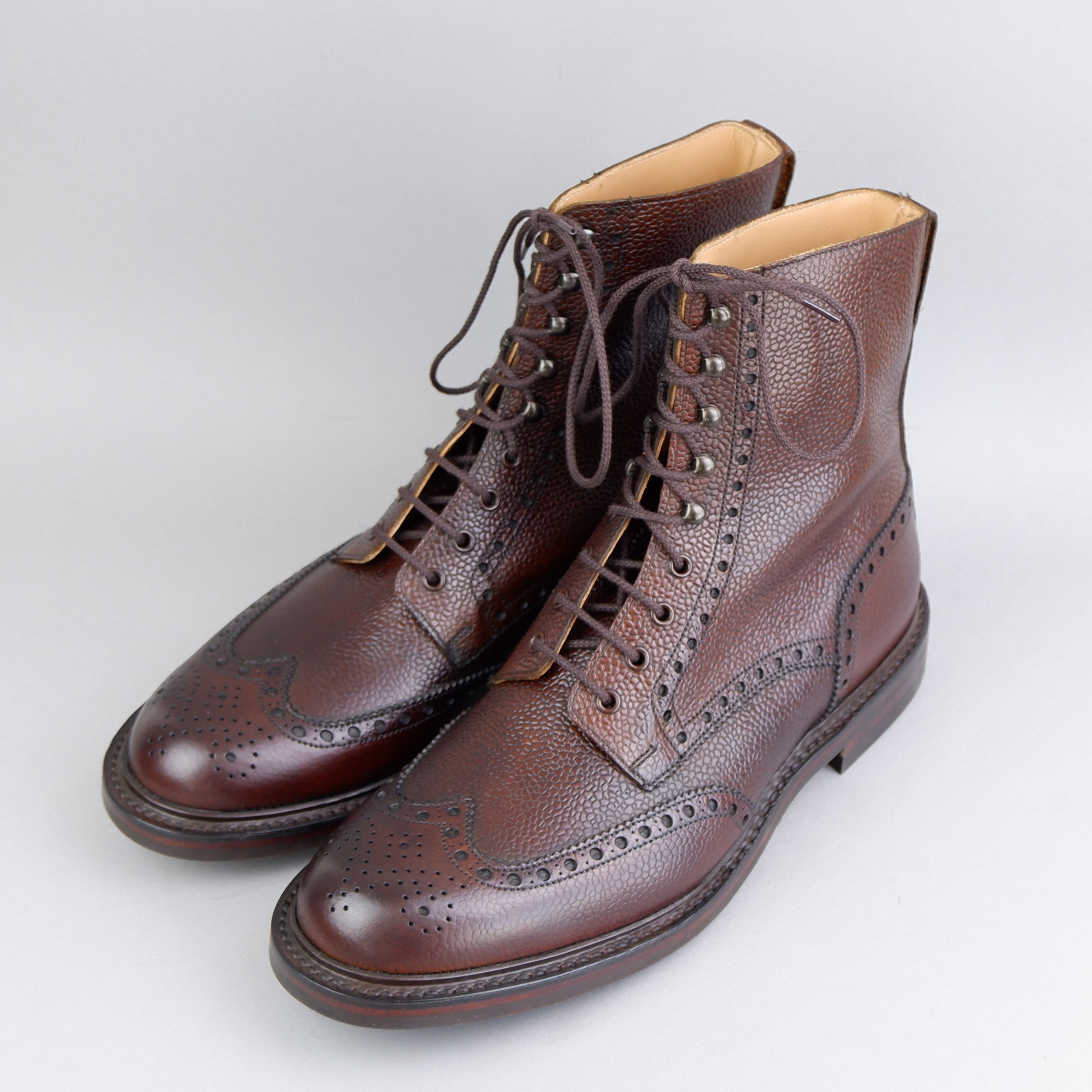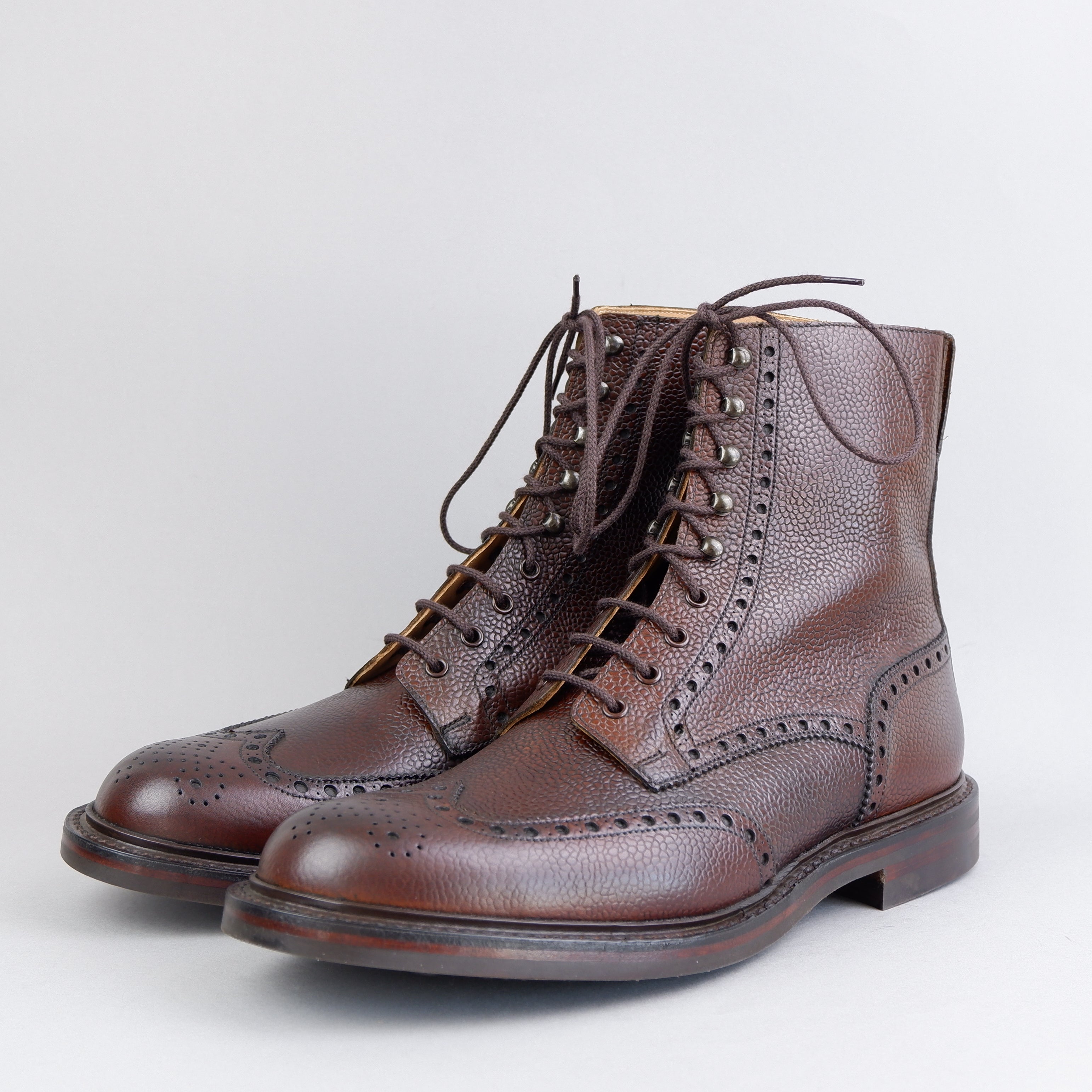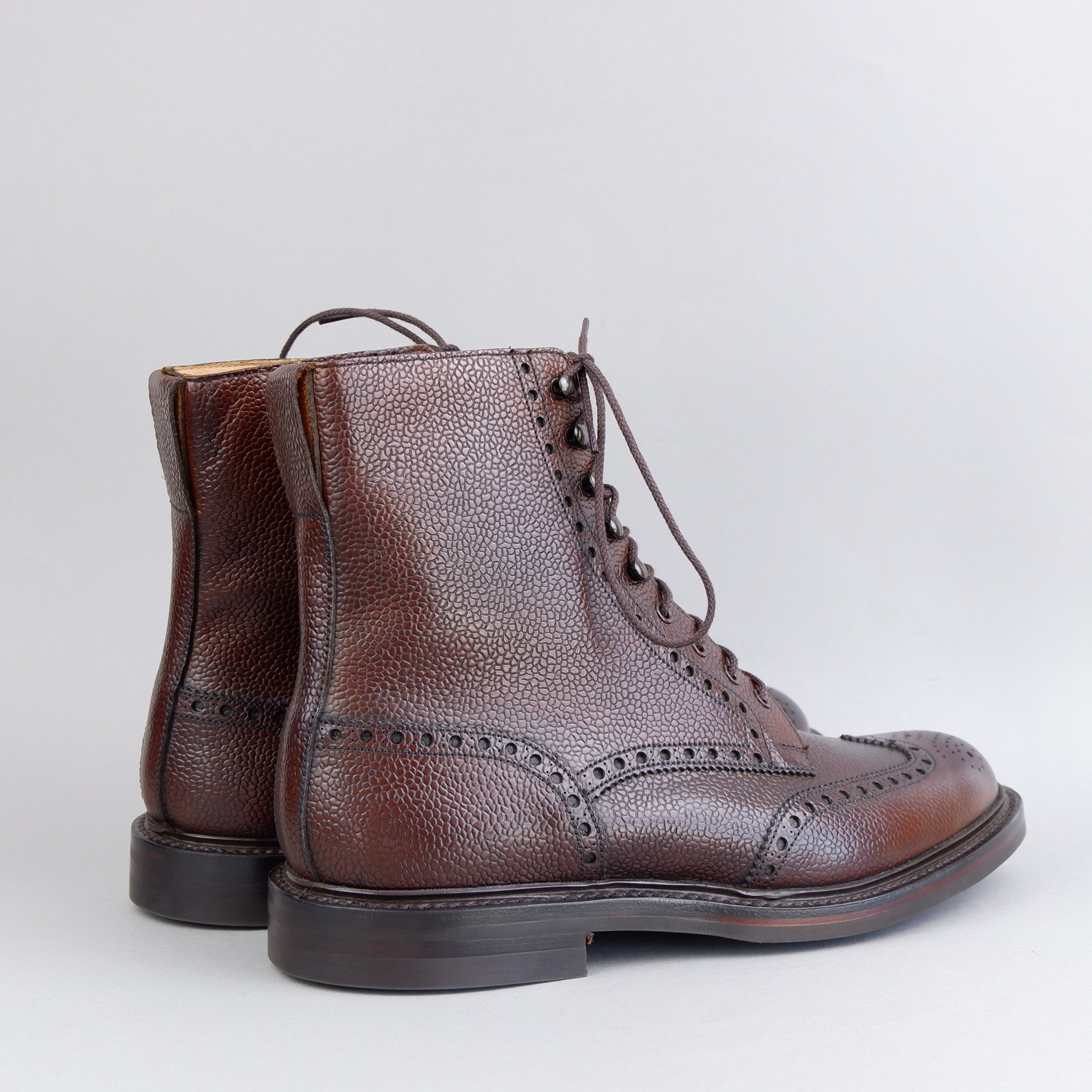 Islay, ein Full-Brogue-Derby-Stiefel mit Flügelspitzen-Design und auffälligen Stanzdetails. Hergestellt aus feinstem dunkelbraunem Scotch-Grain-Kalb mit Dainite-Gummisohle und Sturmrahmen für zusätzliche Wasserbeständigkeit.