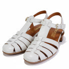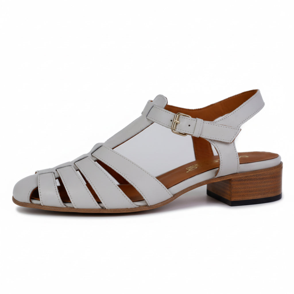 Dieser stilvolle Damenschuh von Maretto in elegantem Off-White ist die perfekte Symbiose aus sommerlicher Leichtigkeit und klassischem Design. Die Sandale im modernen Fisherman-Stil besticht durch ihre breiten, kunstvoll angeordneten Lederriemen im Vorderfußbereich, die dem Fuß einen sicheren Halt geben und gleichzeitig eine charmante Retro-Optik erzeugen. Ein filigraner Fersenriemen mit einer dezenten goldfarbenen Schließe sorgt für eine individuelle Passform und unterstreicht die feminine Ausstrahlung des Modells.