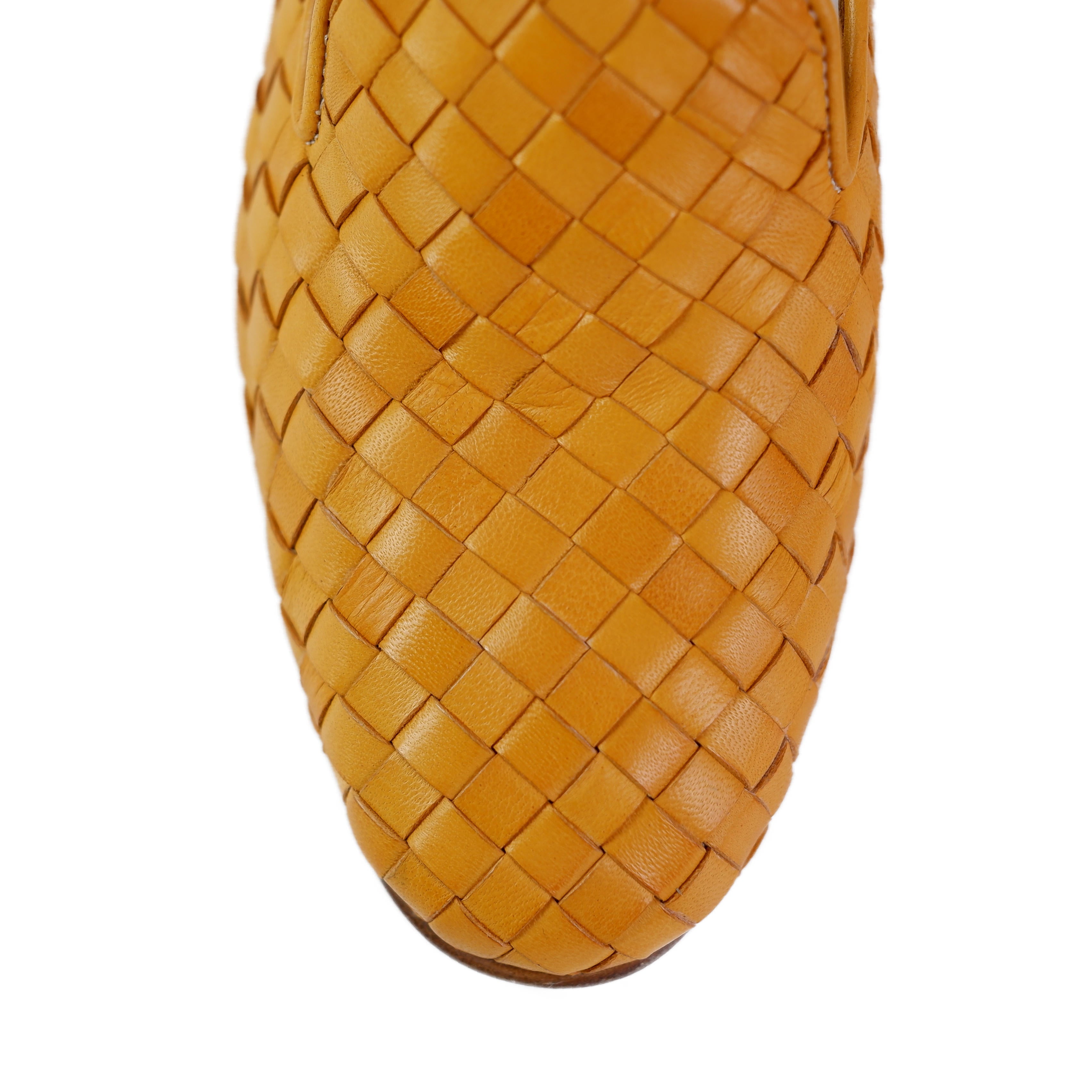 Dieser luxuriöse Slipper von Maretto in einem warmen Senfgelb ist ein exquisites Beispiel für meisterhafte italienische Handwerkskunst und zeitlosen Stil. Das markanteste Merkmal dieses Modells ist die aufwendige Flechtoptik, bei der hochwertige Lederstreifen präzise miteinander verwoben wurden, um eine lebendige Textur und eine außergewöhnliche Haptik zu erzeugen. Diese traditionelle Verarbeitung verleiht dem Schuh nicht nur eine besondere Tiefe, sondern sorgt auch für eine angenehme Flexibilität und Anpassungsfähigkeit am Fuß.