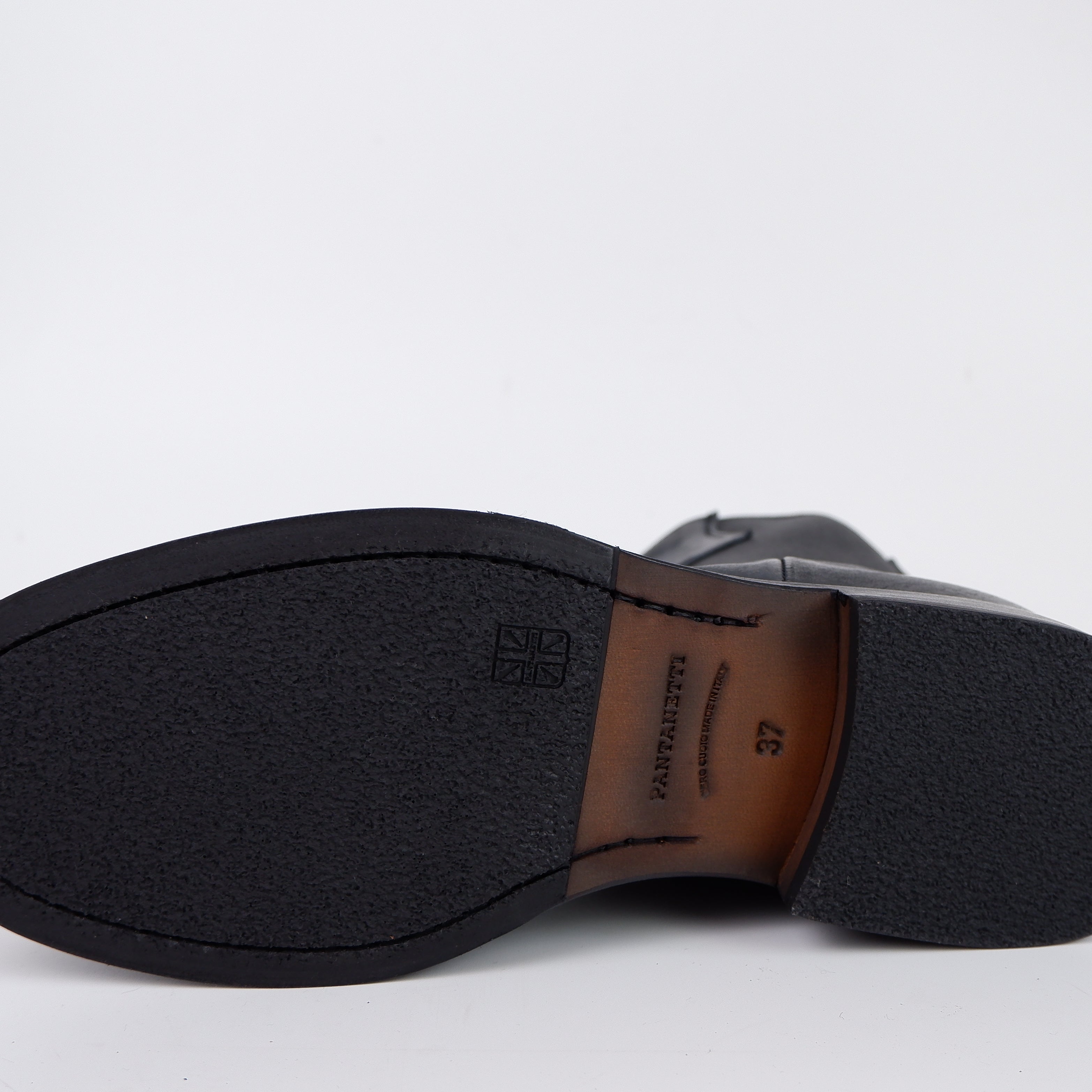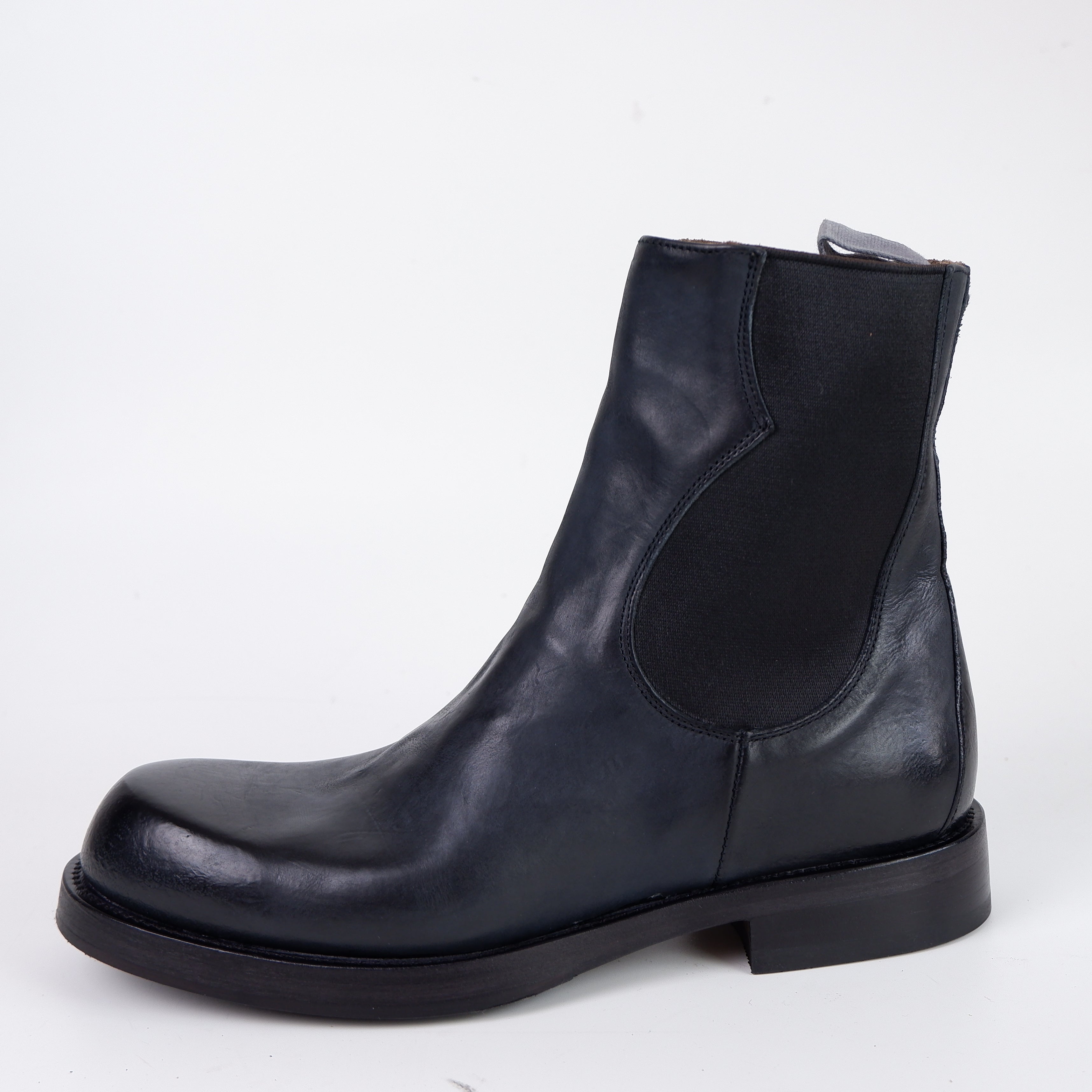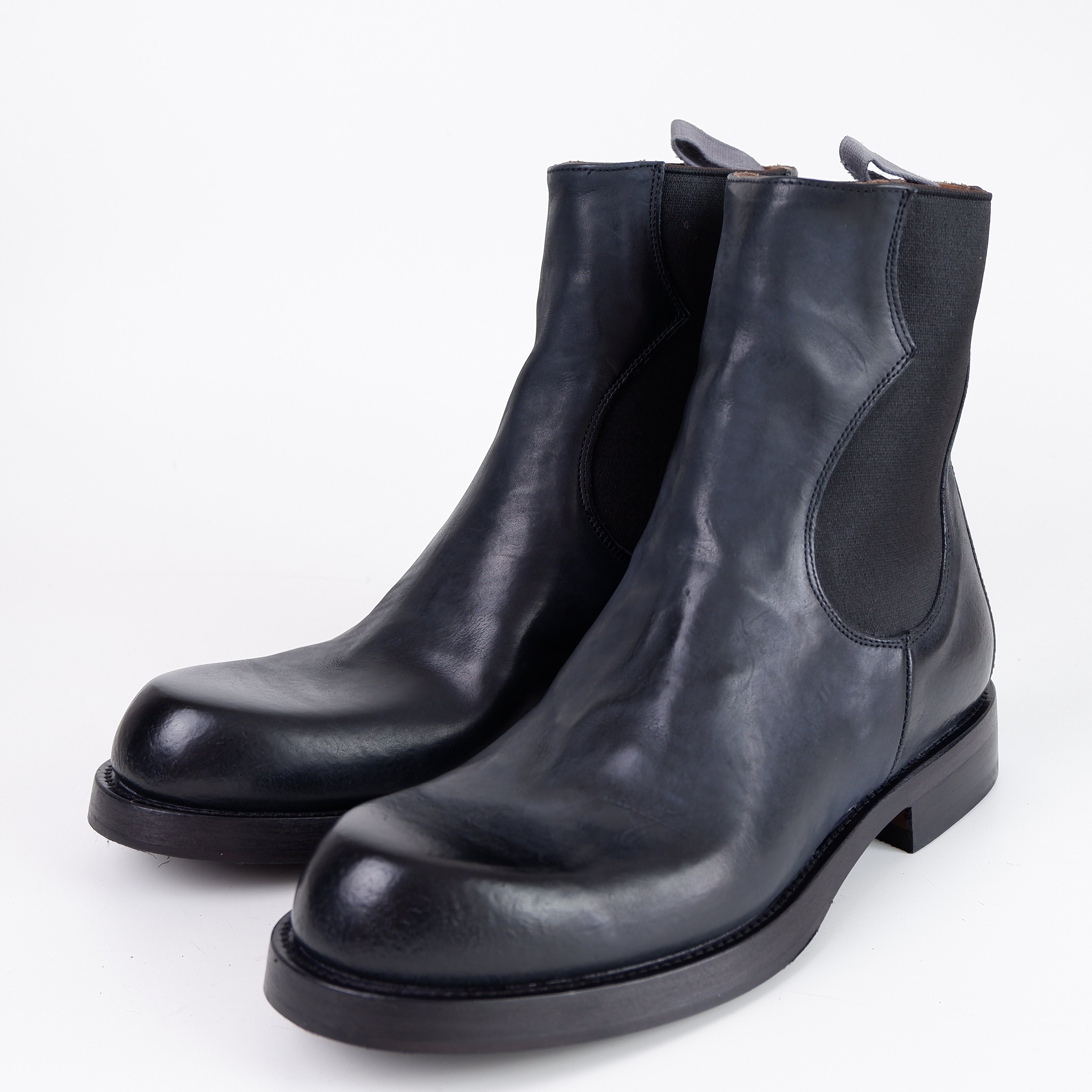 Ein kleiner Zugriemen am oberen Schaftrand erleichtert das Hineinschlüpfen und ist ein praktisches, aber unauffälliges Detail. Die leichte Textur oder die unregelmäßige Farbgebung des Leders verleiht diesen Boots einen einzigartigen Charme, der sie von glatten, hochglänzenden Modellen abhebt.