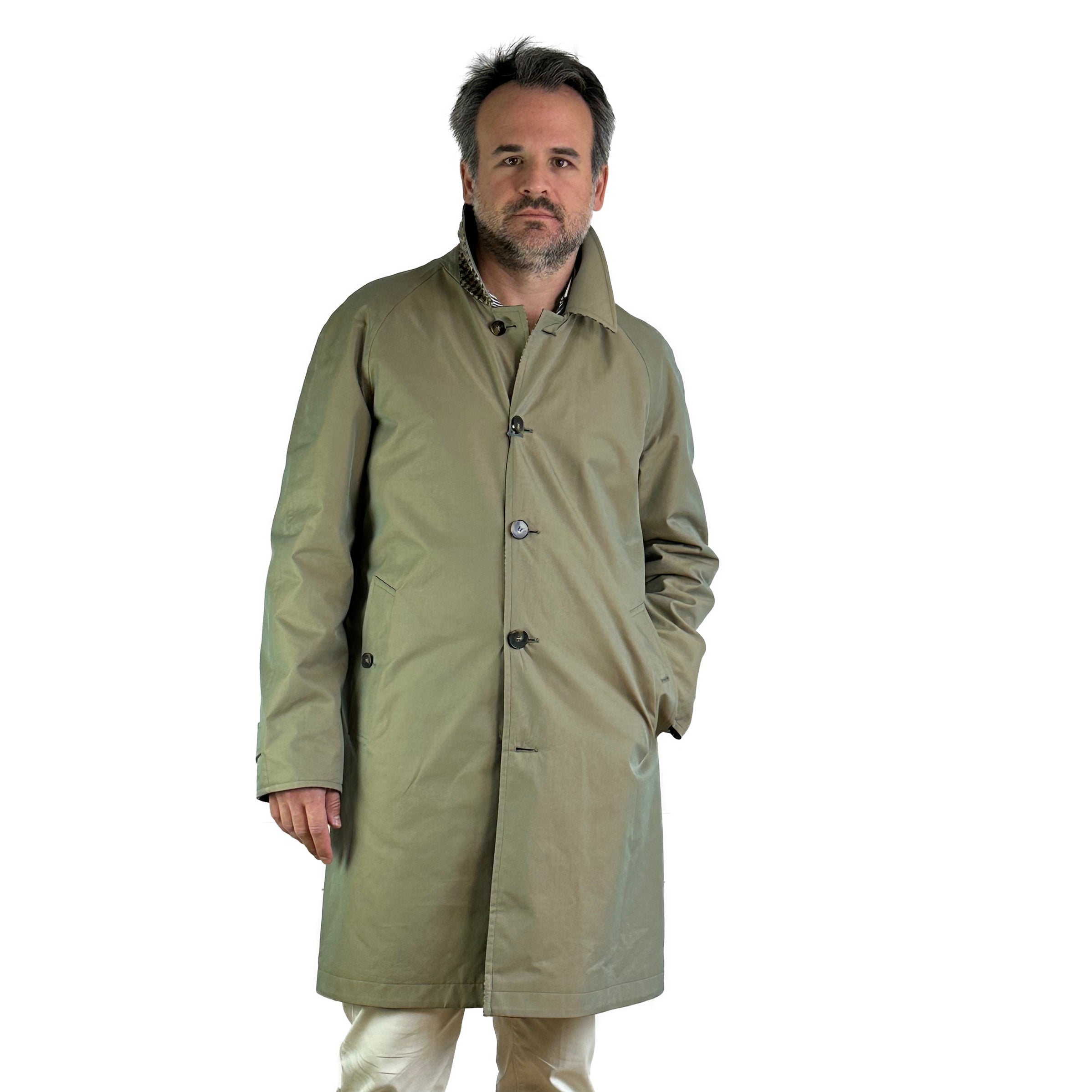 italienischem Touch. Reiner wasserabweisender Baumwoll-Gabardine mit doppelt gezwirntem Garn. Die doppelte Färbung von Kette und Schuss verleiht dem Stoff den typischen schillernden Aspekt des klassischen Solaro.